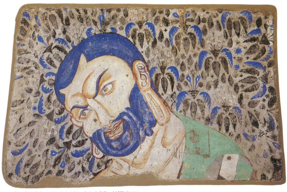 这种形象,可能跟于阗僧人有点接近,是“貌不甚胡,颇类华夏”的形象。如在丹丹乌里克佛寺遗址出土的木版画中,具有高贵身份的于阗地区佛教供养人的面部形象的轮廓线条柔和、鼻背线曲度很小、鼻突浑圆,就跟中原汉人较为接近(图10)。