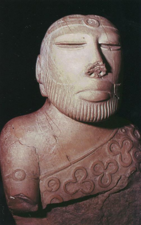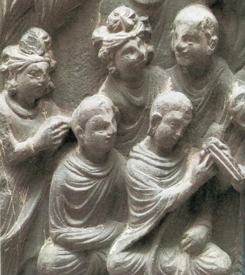 这种“直鼻、厚唇”的印度河流域人种特征,在早期的印度河文明造像中就有典型的反映,如现藏于卡拉奇国家博物馆的公元前2500年的一个“僧侣—国王”形象的造像(图5),其最突出的特征就是方圆形面孔、直鼻、厚嘴唇。所以,来自罽宾地区的僧人,面部特征也应该是鼻子不会很高,但是在面貌上肯定也多少会有一些比较引人注目的特征,如罽宾高僧佛陀耶舍,他在中原僧人眼里是一个仪表风姿俱美的男人,说明其体貌特征完全符合中原人的审美标准,并且有红色的短髭,所以被中原僧众称为“赤髭毗婆沙”。在巴基斯坦斯瓦特博物馆所藏1—3世纪的片岩浮雕《修习经文的僧人》中,手捧梵夹佛经认真诵读、讨论的僧人,虽然可以看出来眼眶较高,但是鼻子却不是那种高鼻带尖的鼻型(图6)。这说明罽宾僧人的形象可能也介于直鼻与高鼻之间——比中原民族的鼻子要高,但是跟康居僧人相比,又可以被中原人的审美标准所接纳。