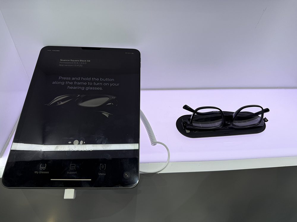 依视路陆逊梯卡此次在展台上推出一款“可以听”的眼镜——Nuance Audio智能助听眼镜