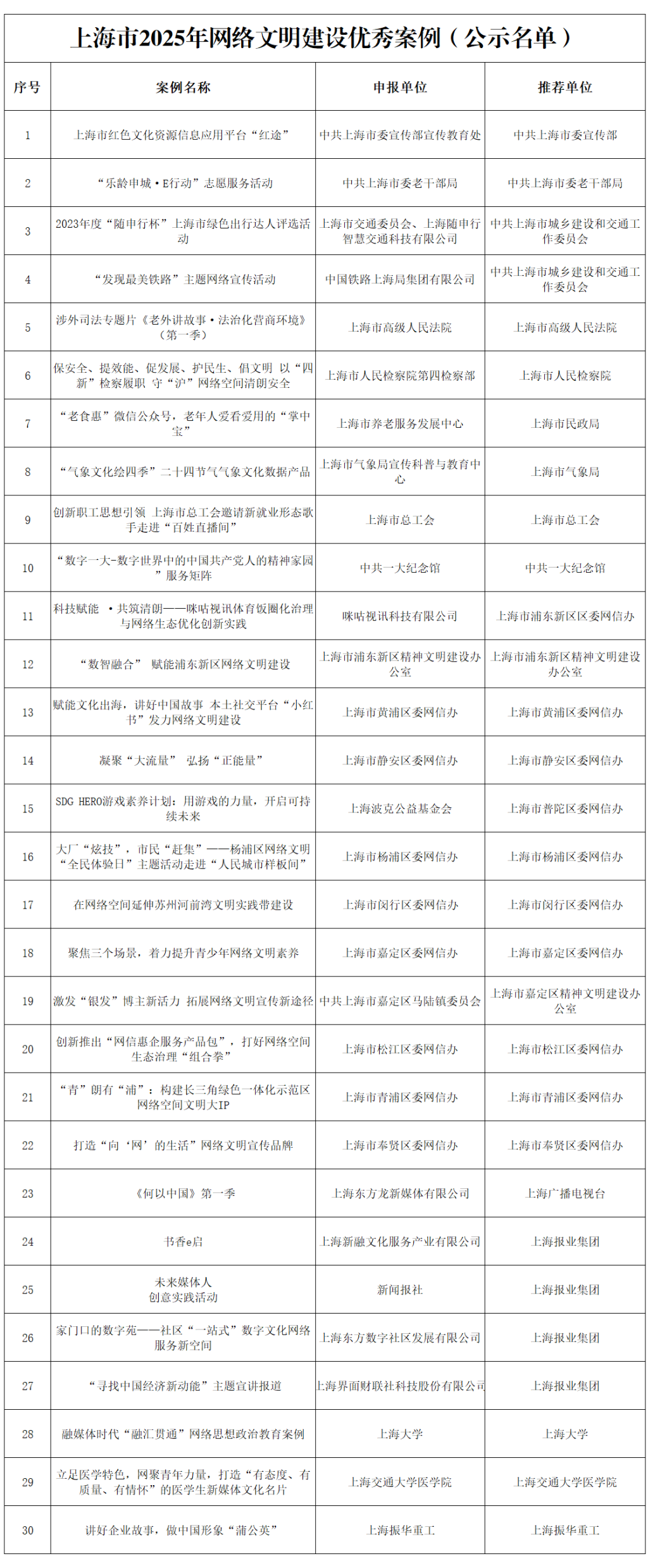 2024年11月18日,中共上海市委网信办、上海市精神文明办联合发文开展2025年上海市网络文明建设优秀案例征集展示活动,受到社会各界广泛关注、踊跃参与。经过初筛、复审、终评等评审环节,现对终选名单进行公示,公示时间为11月11日至11月15日。公示期间,欢迎社会各界监督评议,有关意见可发送至邮箱wxbfgc@shanghai.gov.cn(市委网信办)或wmpyc2024@163.com(市精神文明办),我们将及时受理,认真核查。公示期满后,将适时联合发布最终结果,并进行宣传展示。