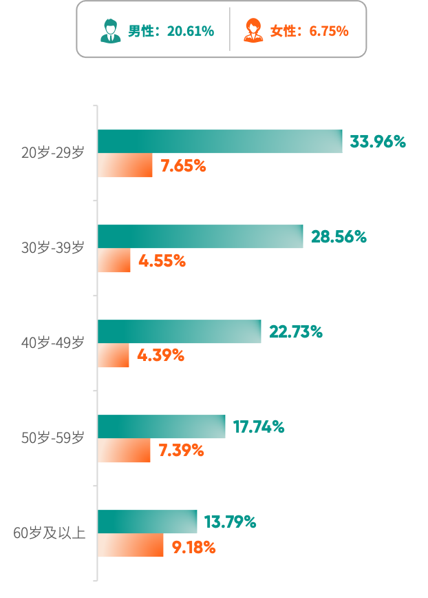 绿皮书显示,银行及保险高净值客户体重指数(BMI)增高检出率为52.87%,男性检出率超7成,并且在各个年龄段的检出率都高于女性,主打一个“稳重”。