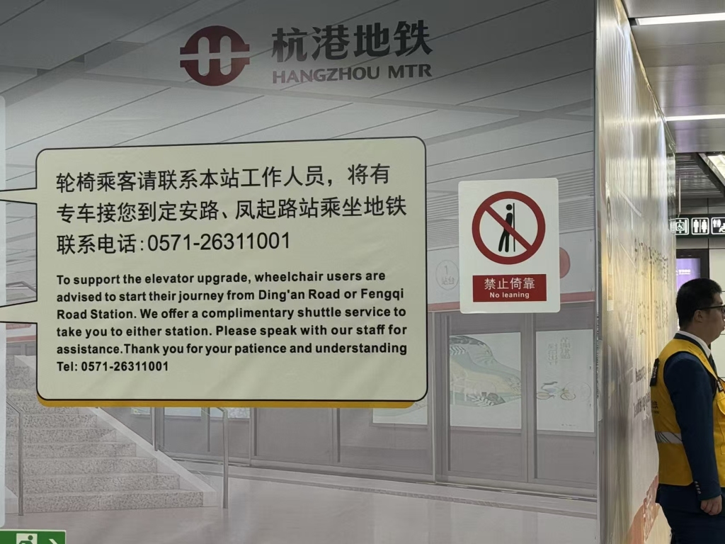 此前,龙翔桥站日均提供无障碍服务约45人次。为了在施工期内保障轮椅乘客的地铁出行,负责1号线运营的杭州杭港地铁有限公司从当地一家巡游和网约车服务企业租来4辆无障碍专车,每天在龙翔桥站与相邻的定安路站、凤起路站间往返接送。这家出行公司曾为2023年杭州亚残运会提供服务,无障碍车辆有斜坡踏板、旋转座椅等,司机接受过无障碍服务培训。