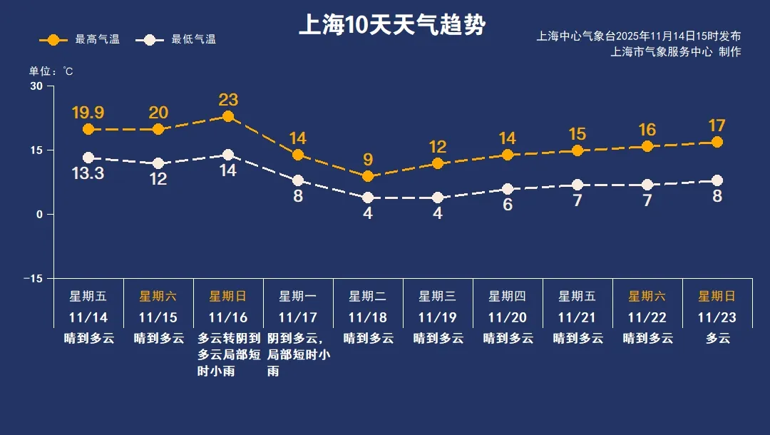 受今年入秋以来首场寒潮影响,16日-18日上海将出现明显大风和降温天气。周日白天还是暖暖的秋,下周一就是另一副面孔:天空阴沉,气温一路下跌,北风凛冽,体感明显变冷。周二全天气温在9℃以下,完全是冬日体感。
